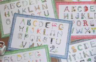 Choose from 20 watercolor letter themes for your alphabet prints, name prints, stationery, or placemats. All items are made-to-order in the USA to minimize our environmental impact.